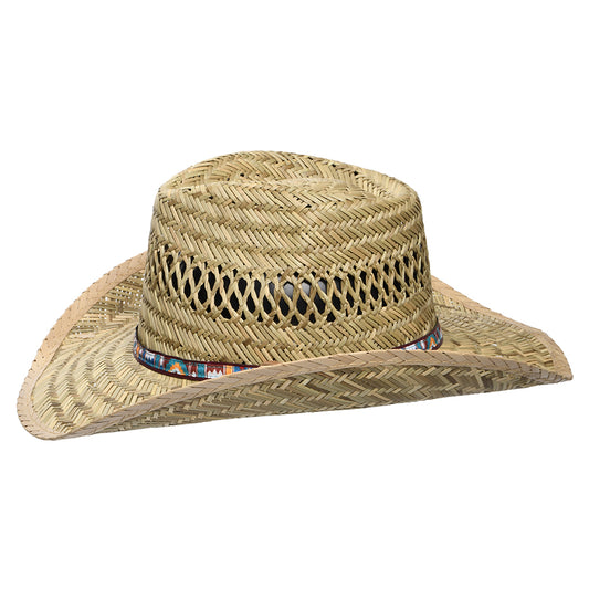 Sombrero Outback de paja de junco con cinta impresa de Dorfman Pacific - Natural Multi