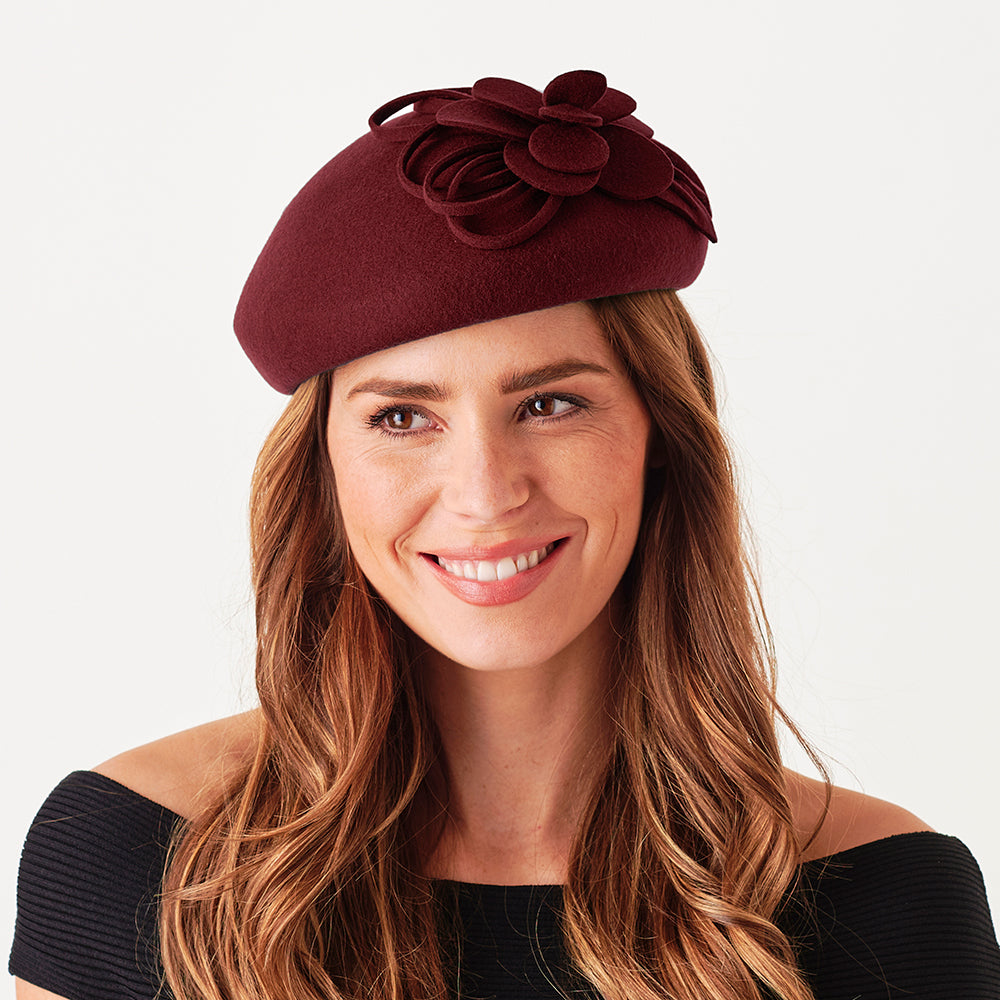 The Marina es una fantástica nueva incorporación a la línea Failsworth. La boina bloqueada en vino presenta un diseño floral decorativo en la parte delantera del sombrero. El sombrero está hecho de fieltro de lana 100% y cuenta con una banda para el sudor ajustable para un ajuste perfecto. Un gran estilo formal para una ocasión formal.