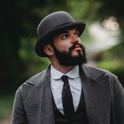 ¡Deje de buscar! Este es sin duda el mejor bombín inglés gris hecho de fieltro de lana que pueda encontrar. Este estilo de sombrero fue creado en 1850 como protección para la guardia inglesa que patrullaba a caballo. Siguiendo con esta tradición, le presentamos esta versión de bombín inglés de Jaxon & James, siendo un poco menos rígido que sus competidores. Este bombín inglés se caracteriza por ser ligeramente menos alto que los posteriores bombines de corte americano. El fieltro de lana con el que está hecho el sombrero es de muy alta calidad y viene forrado por completo. El sombrero cuenta con un lazo decorativo negro de grogrén y una pluma lateral extraíble. Para más información en nuestros sombreros bombín, vea en nuestro sitio los sombreros bombín o nuestra página de sombreros icónicos.