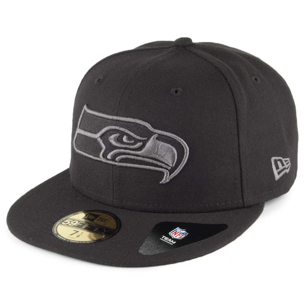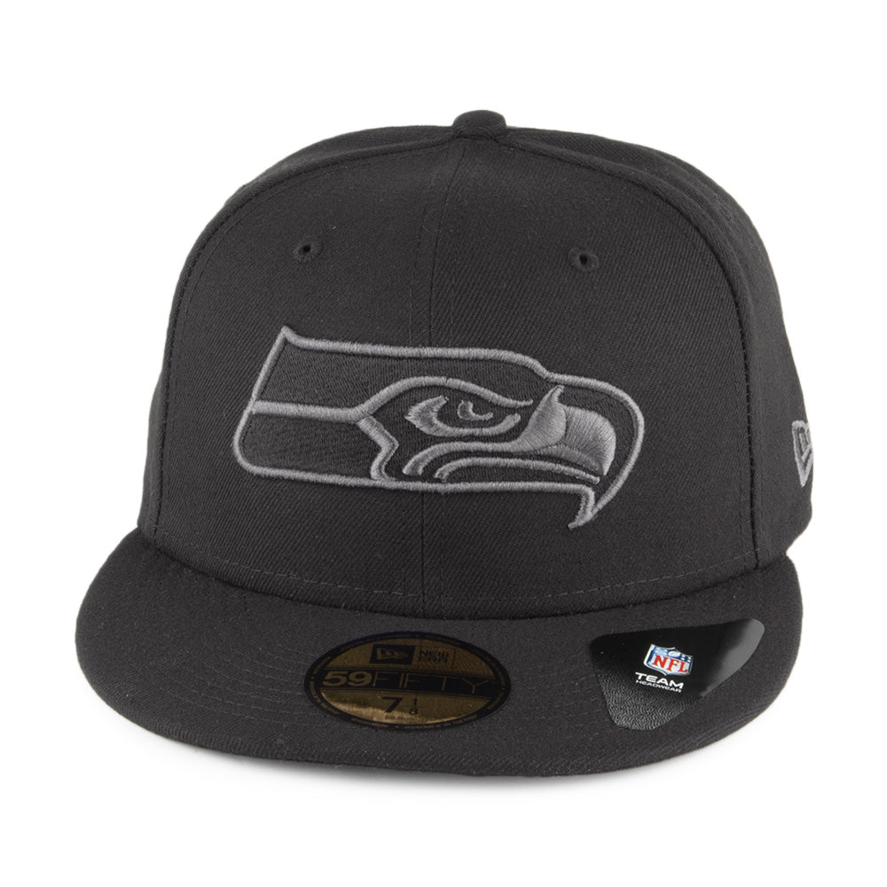 La gorra de béisbol 59FIFTY Black Grap. Seattle Seahwaks de New Era en negro-gris. Esta gorra cuenta con el logotipo de Seahawks en el frontal de la gorra negra. La insignia de New Era está bordado en el lateral y el logotipo de la NFL bordado en la parte trasera.