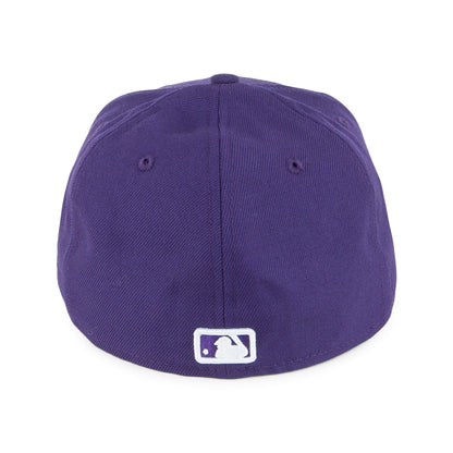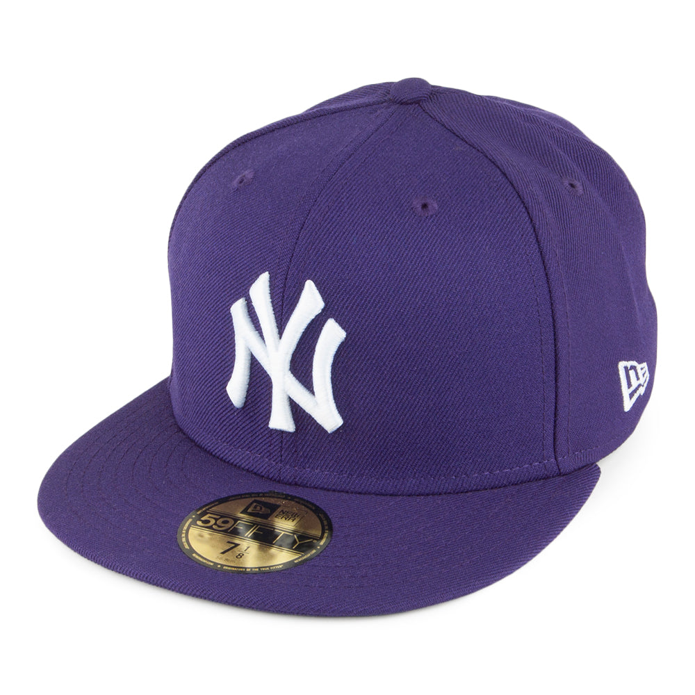 Esta es una gorra de béisbol genuina 59FIFTY con las letras del equipo Yankees de Nueva York bordado en 3D de New Era en morado. El logotipo de New Era está bordado en el lateral izquierdo de la gorra y el logotipo de MLB está bordado en la parte trasera. La gorra cuenta con una visera plana y ojales para ventilación.