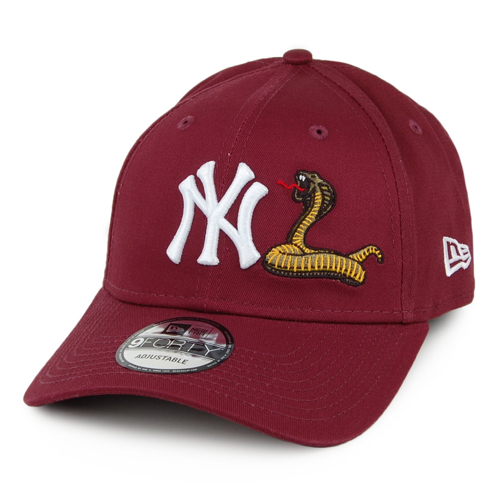 Gorra de béisbol 9FORTY MLB Twine de los Yankees de Nueva York de New Era en granate. Este estilo único tiene el logotipo del equipo bordado en el frontal de la gorra con una serpiente a un lado. La insignia de New Era está bordada en el lateral y hay un broche ajustable en la parte trasera. La gorra está hecha de algodón