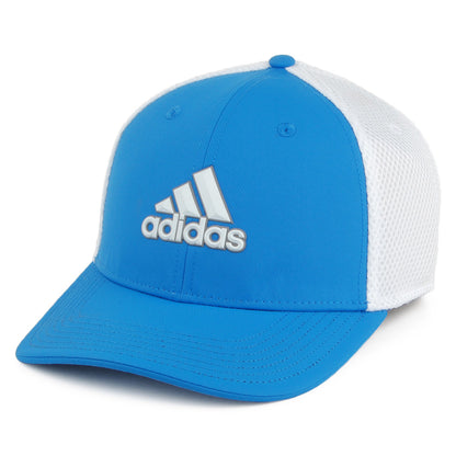 Aquí está la gorra de béisbol A Stretch Tour de Adidas en azul-blanco. Esta gorra de béisbol cuenta con el logotipo de Adidas en la parte delantera y la marca con el nombre de Adidas Golf en la parte trasera. La parte trasera hecha de malla proporciona una gran ventilación y hay una cinta elástica que permite que la gorra se ajuste cómodamente.