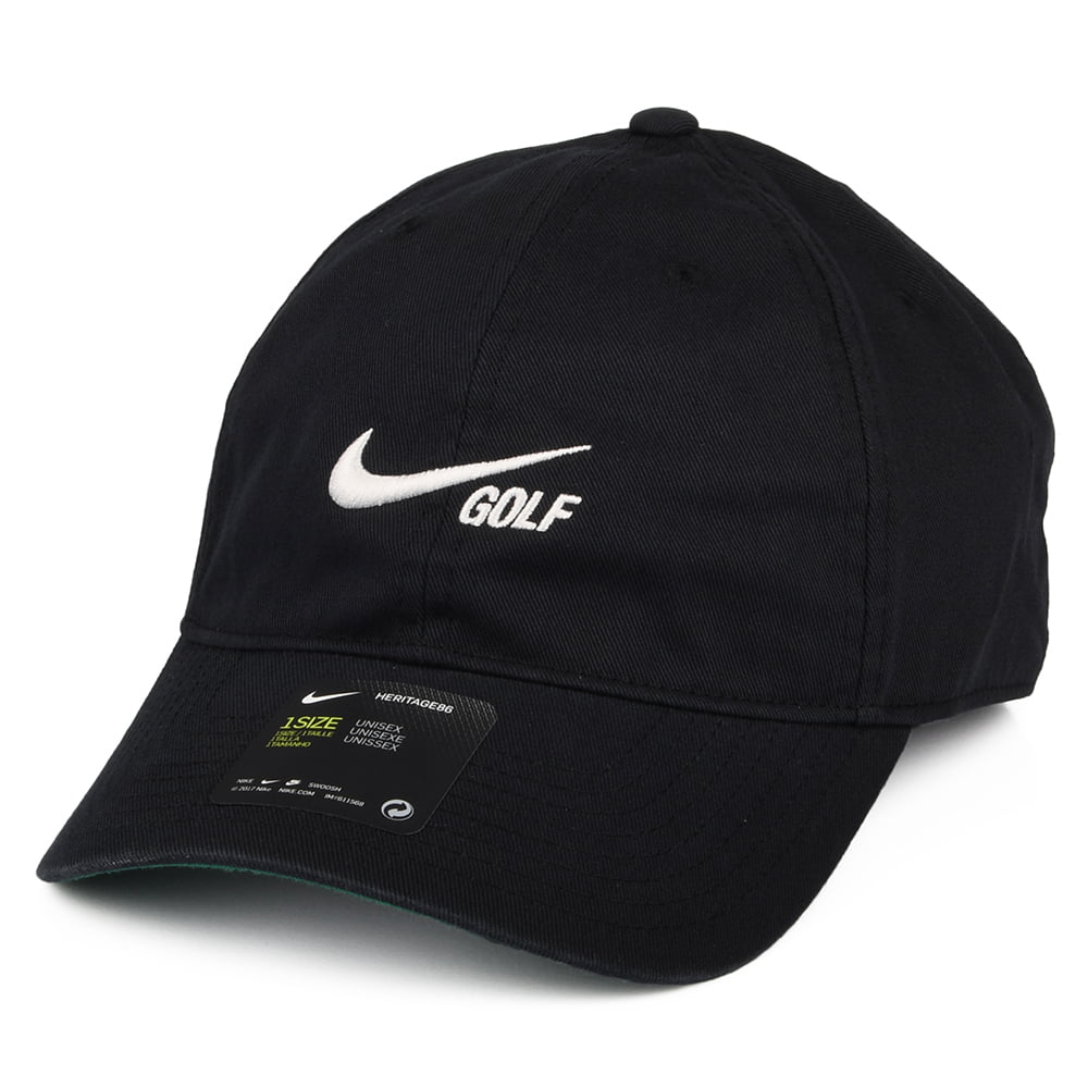 Aquí está la gorra de béisbol Heritage 86 Washed Solid de Nike Golf en negro. Hecha de 100% algodón, esta gorra de béisbol cuenta con el logotipo de Nike Golf bordado en la parte delantera de la corona no estructurada. Hay una etiqueta Nike Golf junto a la correa ajustable en la parte posterior.