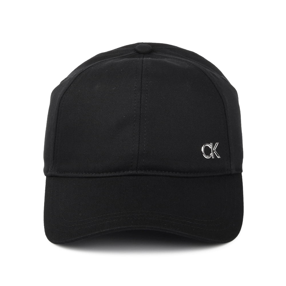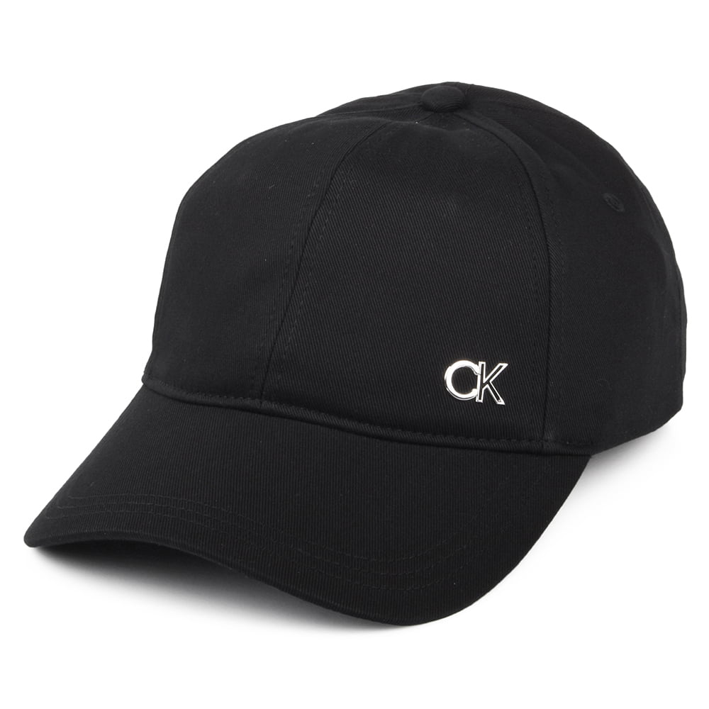 Esta es la gorra de béisbol Metal CK de Calvin Klein en negro. La gorra tiene una visera curvada, ojales y una tira ajustable en la parte trasera. El logo metálico de la marca aparece en el panel frontal izquierdo de la gorra.