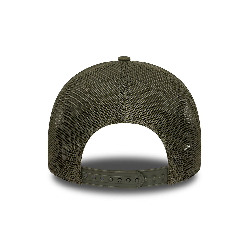 La gorra de camionero A-Frame MLB Outline L.A. Dodgers de New Era en verde oliva cuenta con el logotipo del equipo bordado en la parte delantera de algodón estructurado. La bandera de New Era está bordada en el lado izquierdo. La parte posterior de malla tiene un broche ajustable para que el sombrero se ajuste a muchos tamaños.
