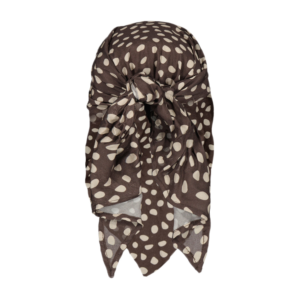 Desde la copa, cae una tela estilo pañuelo suave que puede ser atada detrás para un look personalizado, mientras que su gran longitud ofrece protección al cuello contra el sol. El intenso tono café, acentuado por un divertido patrón a lunares, da un toque de encanto retro a los atuendos para días de tiempo cálido.
