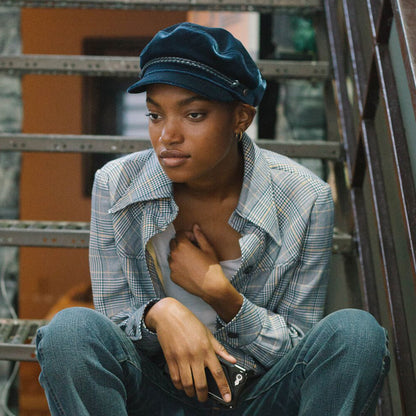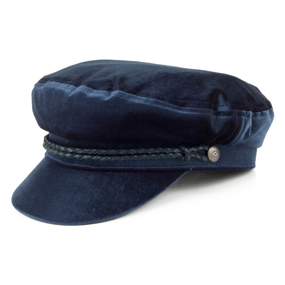 Esta es la gorra marinera Ashland de velour de Brixton en azul oscuro. Cuenta con una cinta decorativa de cuerda de piel que decora la parte delantera de la copa y se fija a ambos lados con unos botones metálicos de Brixton. El interior de la gorra está forrado con satén y también tiene una cinta interior de algodón.