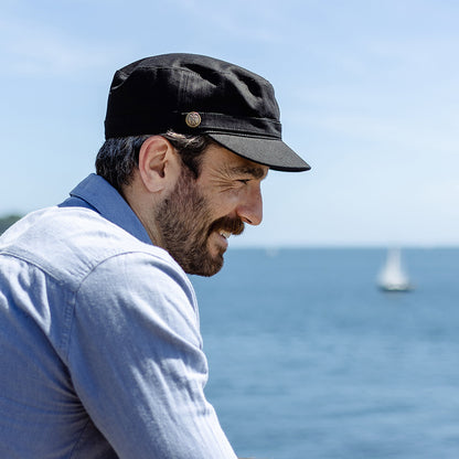 La gorra está totalmente forrada en satén e incluye una cinta interior de algodón. La gorra está acabada con una cinta decorativa a juego e insignias marineras de metal en ambos lados.