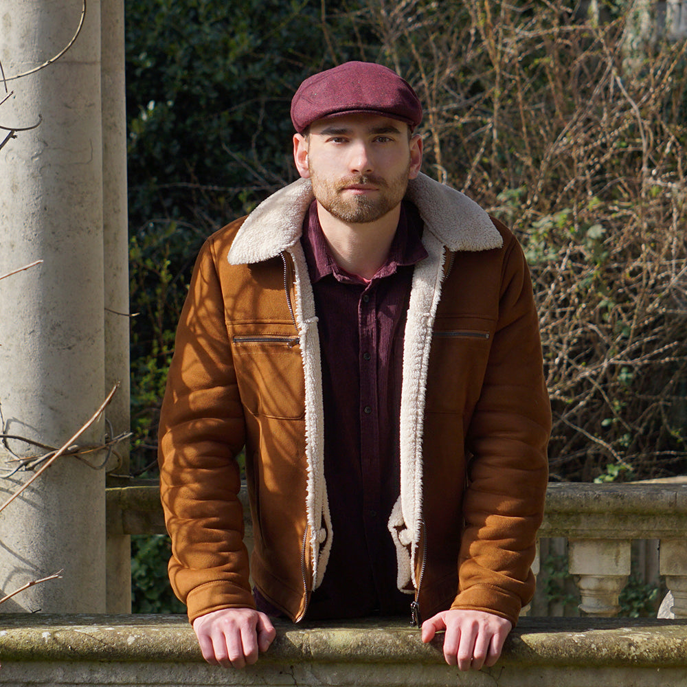 Aquí está el gorra plana Hillcrest diseño de espiga de Jaxon & James en color rojo burdeos-negro. En el interior cuenta con un forro de satén y una cinta para mayor comodidad. La parte frontal de la gorra está asegurada al borde con un único botón de presión. Esta clásica gorra plana de espiga salpicada está acabada con una insignia de Jaxon & James en el lateral.