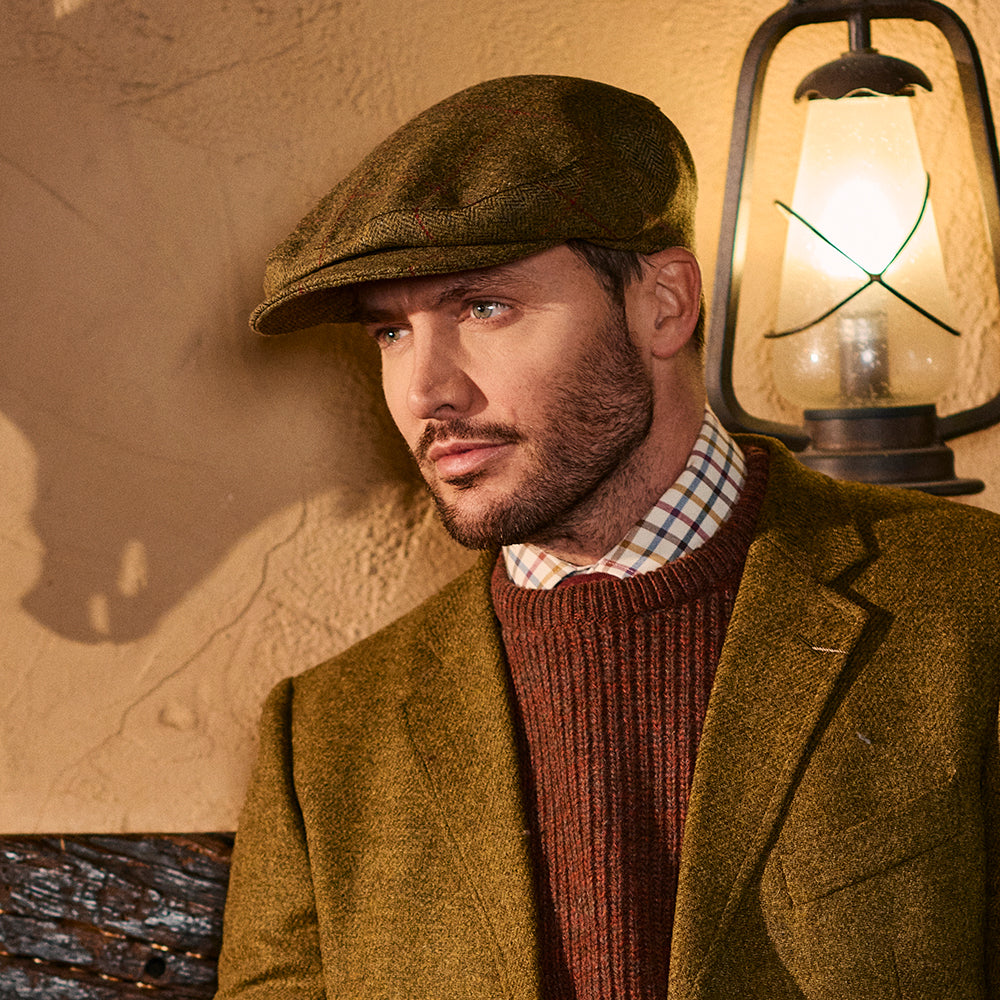 La gorra plana Manor con espiga a cuadros de Failsworth en verde musgo-rojo es un estilo clásico para las temporadas de otoño e invierno. Este sombrero está hecho de un tweed de lana suave y duradero de Lovat de Escocia. La corona está unida a la visera por un botón de presión y cuenta con un forro de satén y una cinta interior de grogrén. El material exterior de la gorra ha sido recubierto para mejorar la resistencia al agua y la resistencia a las manchas. Hay una insignia de Failsworth extraíble en el lado.
