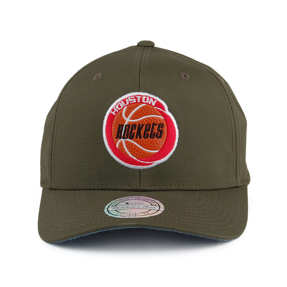 Esta es la gorra Snapback Ripstop Battle Houston Rockets de Mitchell & Ness en verde militar. La gorra tiene el logotipo del equipo en la parte delantera y el logo de la marca está bordado en la parte trasera.
