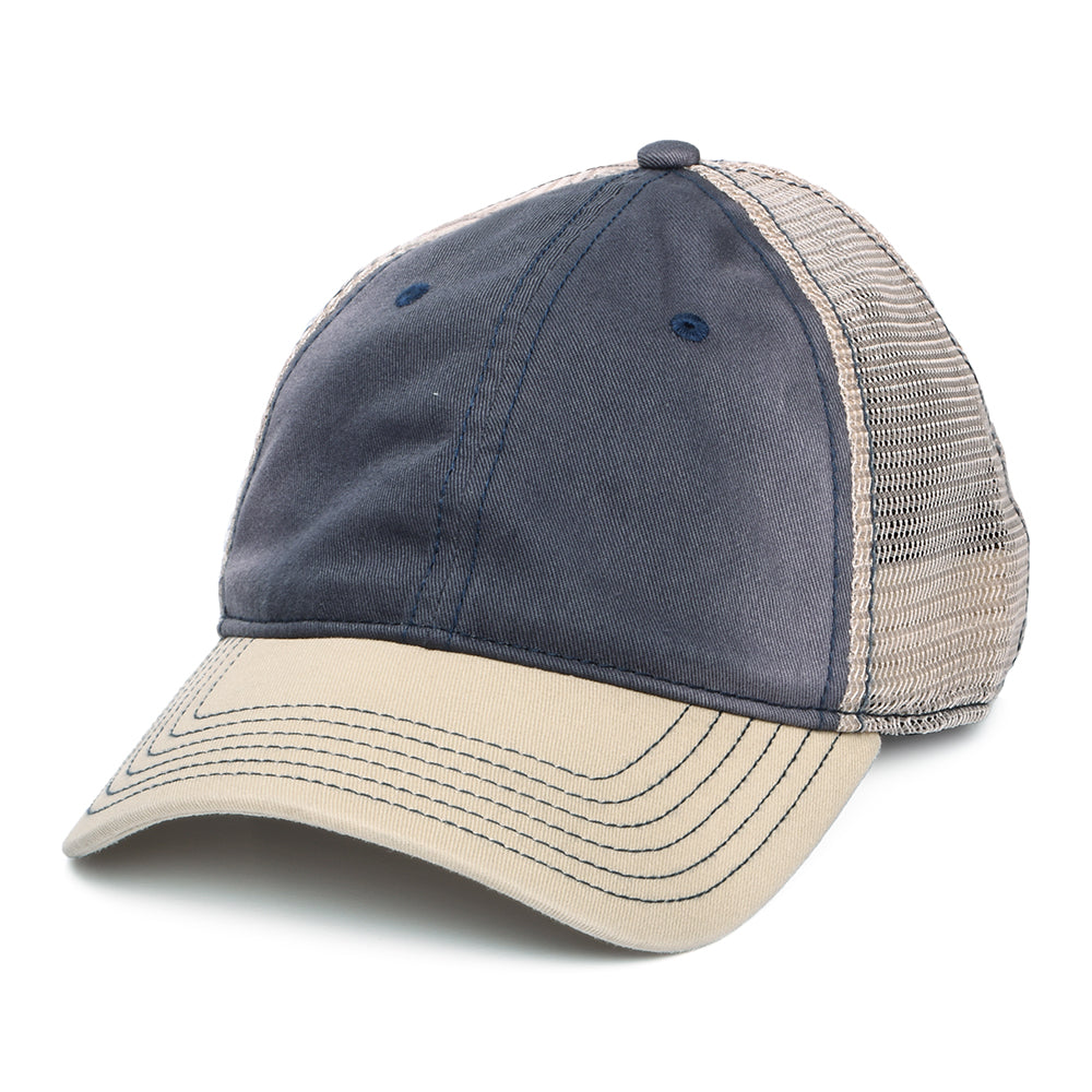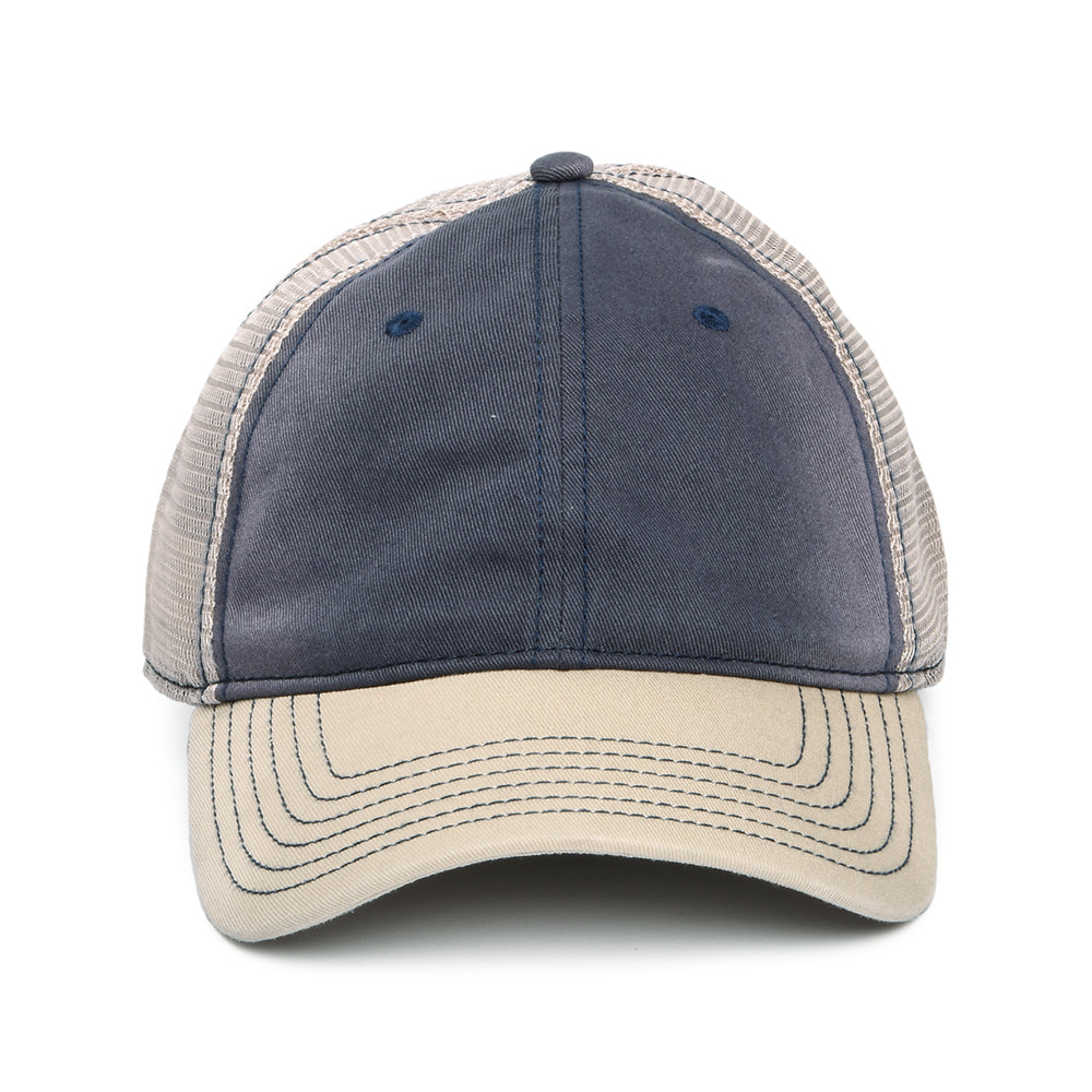 Esta es la gorra Trucker de algodón de Dorfman Pacific en azul marino. La parte frontal tiene un aspecto desgastado y la malla en la parte trasera es muy suave. La gorra trae una tira ajustable en la parte trasera y una visera curvada.