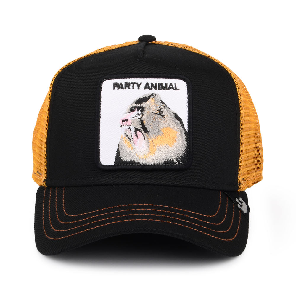 La gorra trucker Party Animal de Goorin Bros en negro es una gorra de béisbol con malla trasera y una imagen personalizada de Party Animal con tejido amarillo en la visera que combina con los paneles de malla traseros. La etiqueta bordada de Goorin está cosida en el lado izquierdo de la visera.