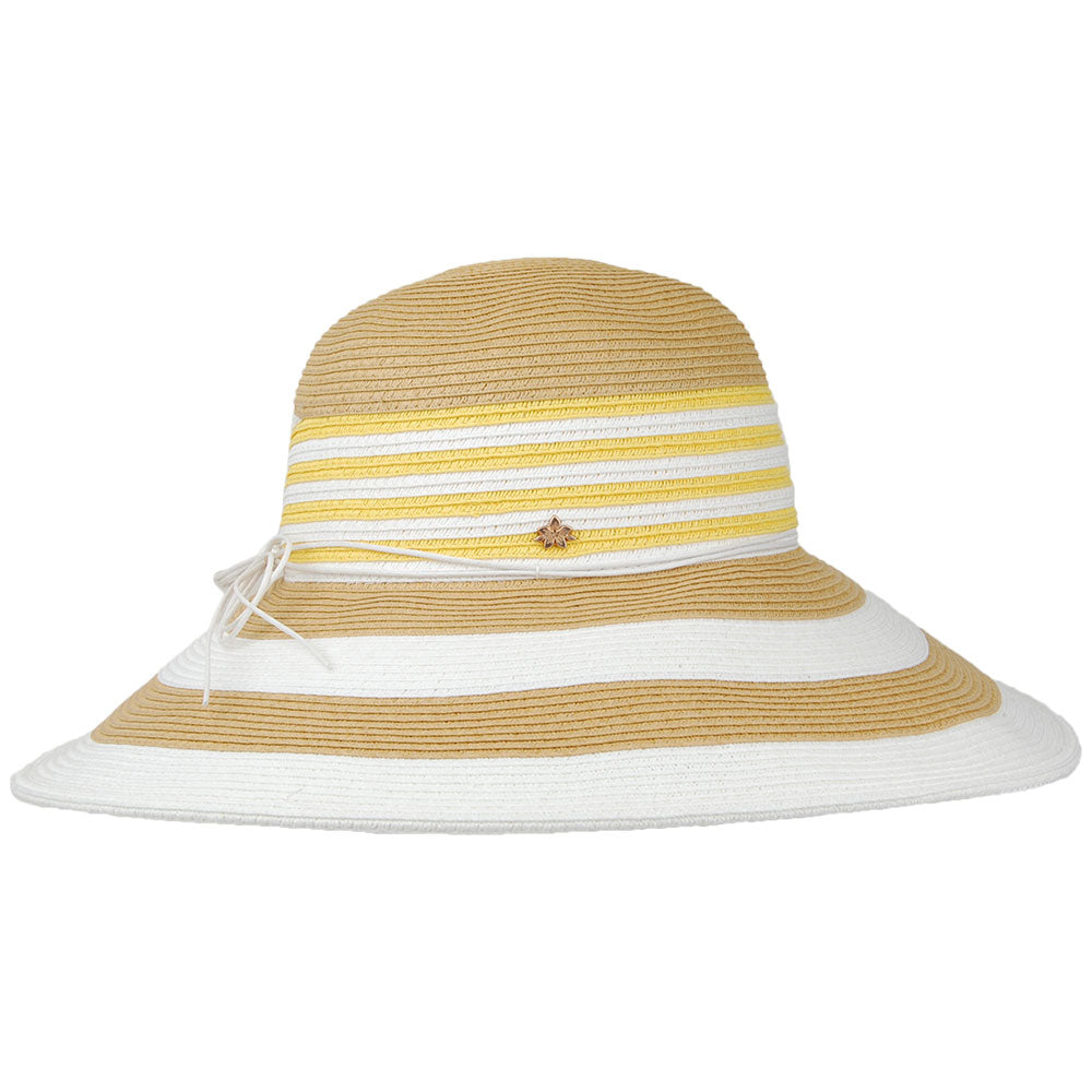 Este es el sombrero Ahina Lampshade de Cappelli en natural multi. Este sombrero único tiene una corona a rayas multicolores y un ala ancha. Está decorado con un cordón doble que termina en un lazo. Tiene el logotipo pequeño de Cappelli en el lateral. El sombrero no tiene forros y cuenta con una cinta interior de grogrén con cordón regulable para un ajuste cómodo.