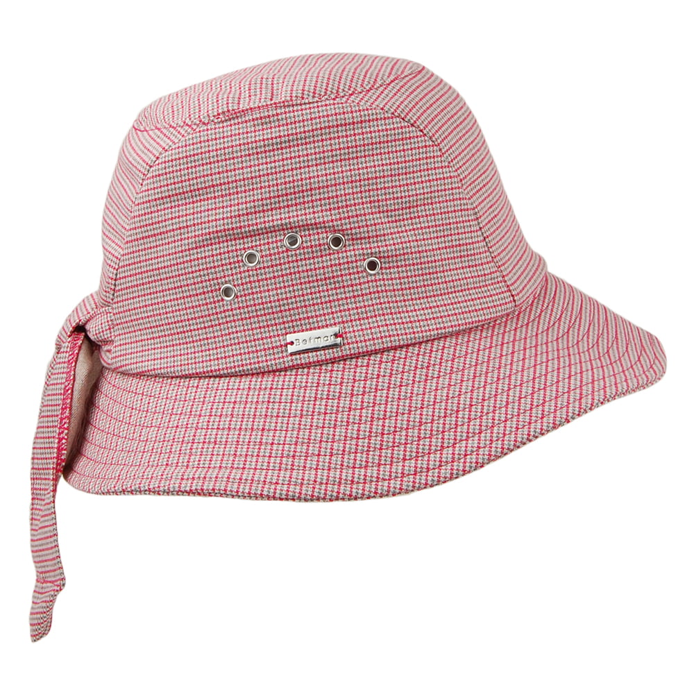 El sombrero Cloche anudado con diseño pata de gallo de Betmar en rojo-multi. La corona redonda de 11.5 cm de alto tiene 5 ojales transpirables en cada lado. Se anuda en la parte trasera de la corona para añadir un acento decorativo y ayuda a que el sombrero se ajuste. El ala cosida mide 5 cm de ancho en la parte trasera y 5.7 cm de ancho en los 3 lados restantes.