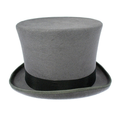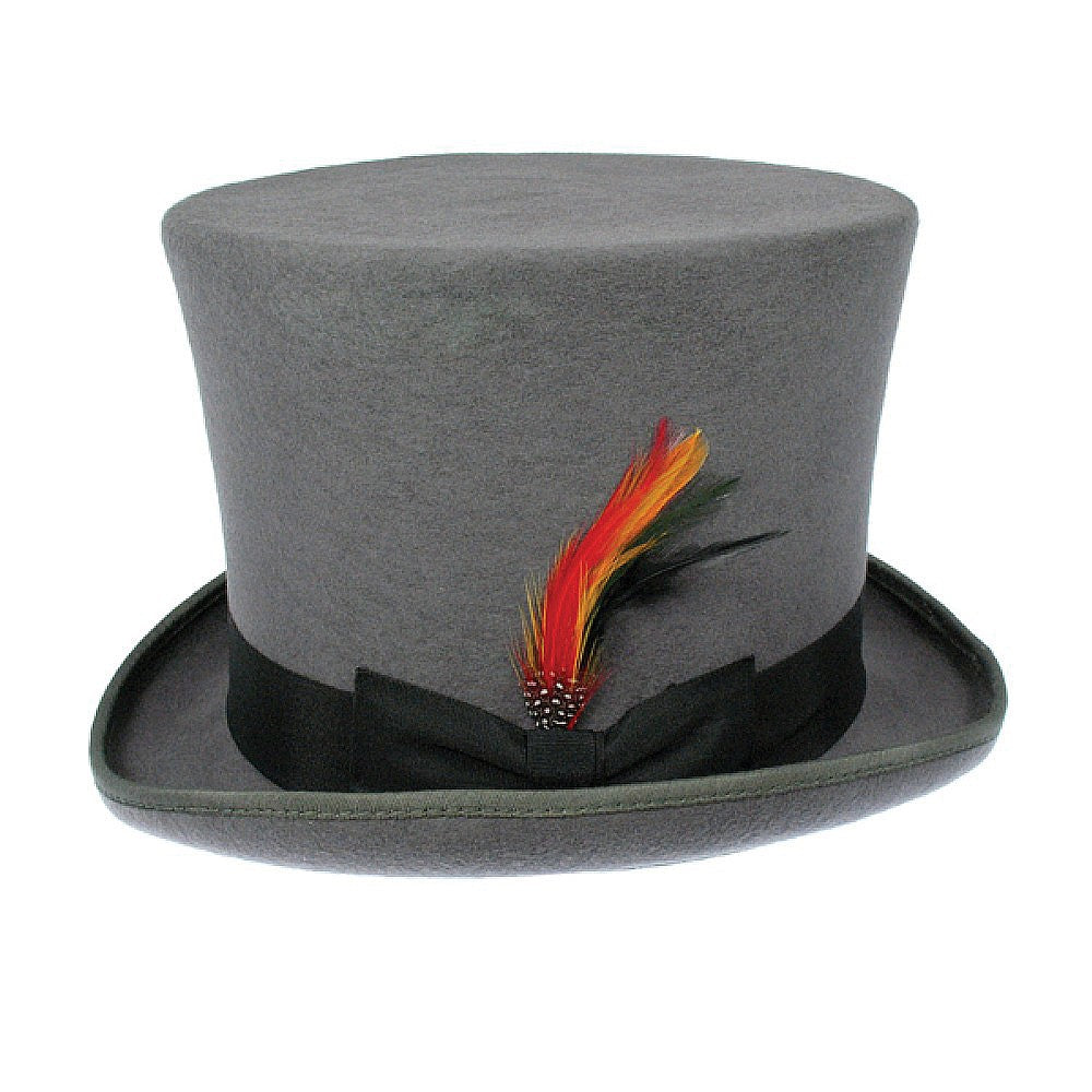 En aquellos días en que la mayoría de los hombres aspiraban a ser considerados caballeros, el sombrero de copa era una señal visible de que lo habían conseguido. Este sombrero gris de fieltro de lana tiene una copa de 15 cm de alto que se va estrechando hacia afuera. El ala mide 5 cm de ancho con la curvatura tradicional victoriana. La cinta decorativa está hecha de grogrén con un lazo lateral mide 5cm de ancho. El sombrero está totalmente forrado en satén y cuenta con una cinta interior de cuero de imitación y una pluma lateral extraíble.