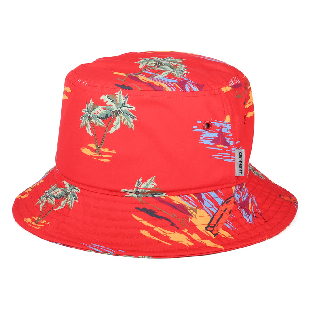 Este es el sombrero de pescador Beach de Carhartt WIP en rojo. El sombrero cuenta con un patrón de escena de playa en todo el sombrero. Hay una etiqueta de Carhartt cosida al lado del sombrero. Hay ojales en el lado para garantizar la ventilación. Este es un buen estilo de verano de Carhartt WIP