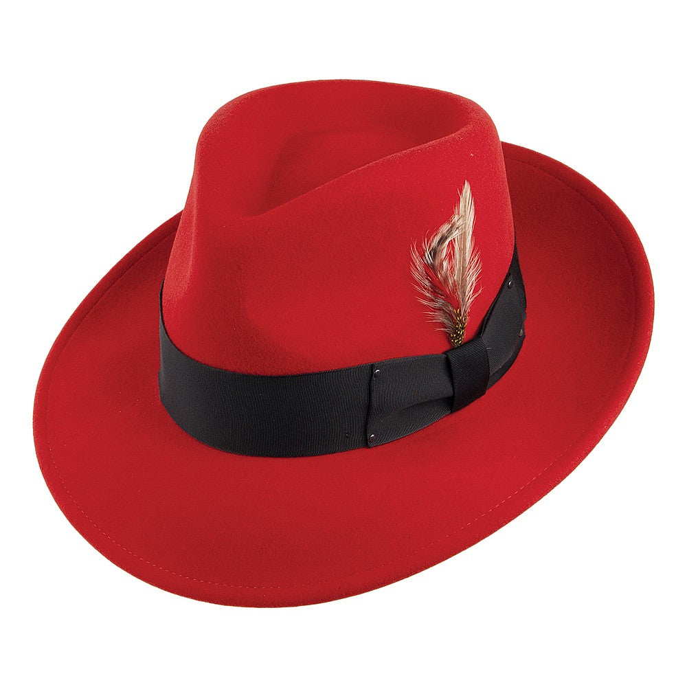 Este es el sombrero fedora 7002 en rojo. Con su ala de 7 cm de ancho y su fieltro de lana resistente y plegable, este sombrero lo tendrá con estilo en la pista de baile sin preocuparse demasiado por su sombrero. Tiene también una corona de 11 cm de alto, una pluma y el nombre de Bailey impreso en la cinta decorativa.