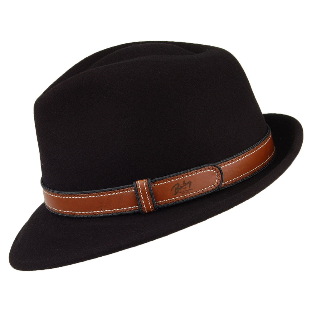 El sombrero Fedora Dodgson de fieltro LiteFelt de Bailey en negro. El sombrero de color negro está hecho del fieltro de Bailey LiteFelt que es plegable y repelente al agua. Hay una cinta decorativa de piel con el logotipo de Bailey impreso en el lateral.