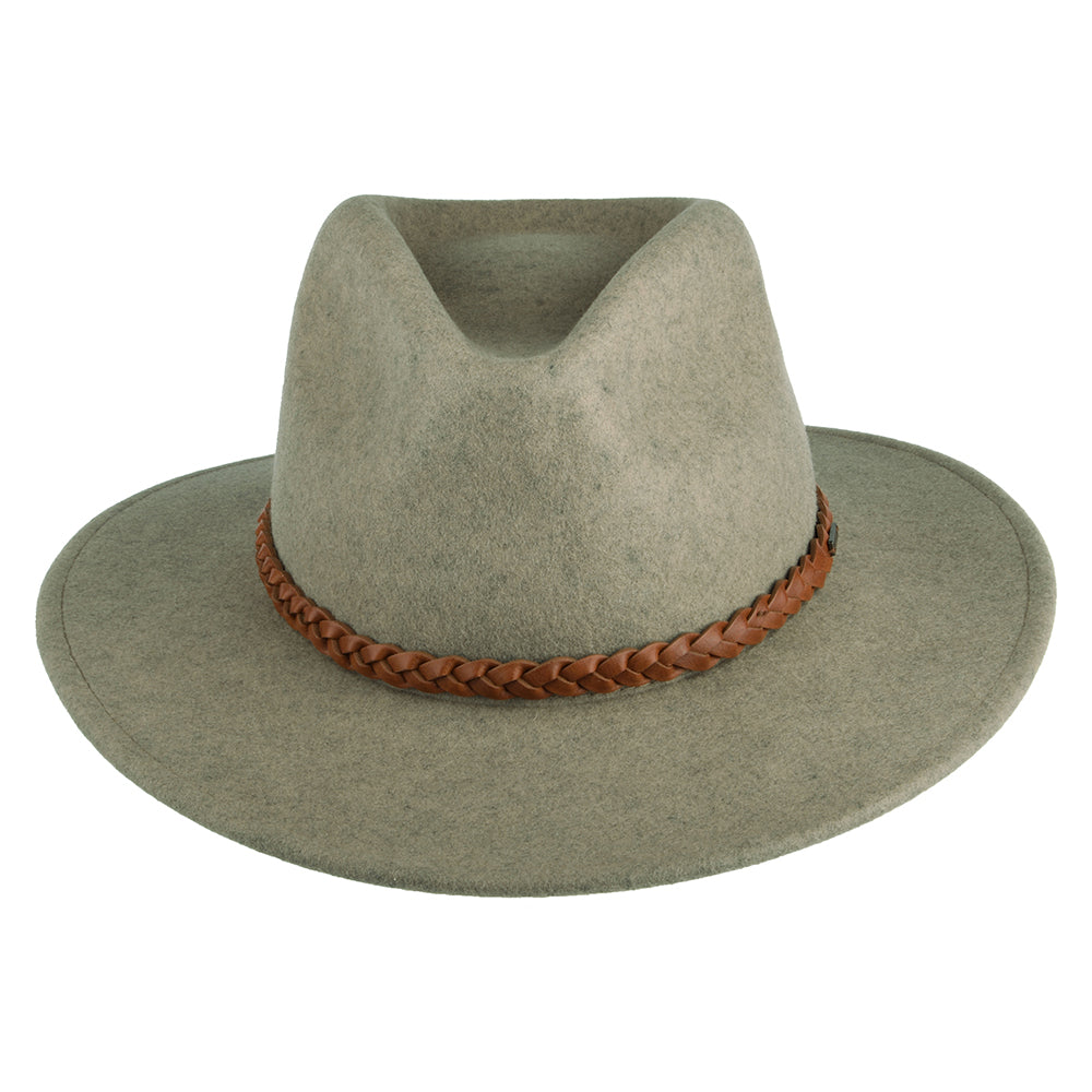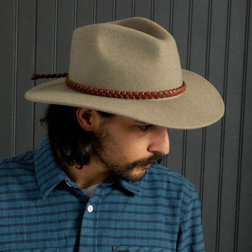 Este sombrero fedora de brezo natural combina el estilo clásico de la silueta Messer con un ala ligeramente más grande para una estética occidental. Terminado con una banda de sombrero de piel sintética trenzada de primera calidad y un pin de Brixton en el costado, este sombrero no tiene forro y es más rígido que el Messer original. La banda para el sudor de algodón viene con una correa de gancho y bucle ajustable para un ajuste perfecto. La lana utilizada para hacer este sombrero está certificada como libre de crueldad por RWS, un estándar voluntario que aborda el bienestar de las ovejas y la tierra en la que pastan.