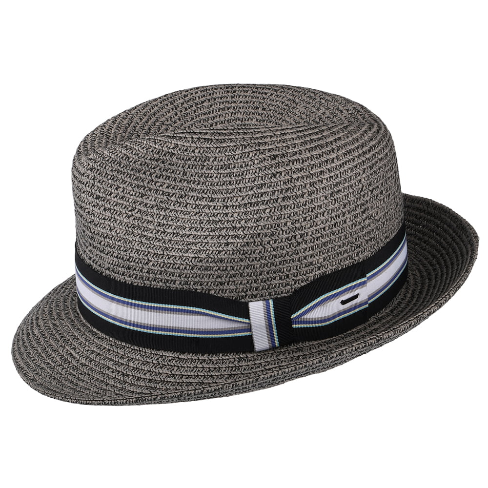 Aquí está el sombrero fedora Salem Special de Bailey en gris. Este estilo de verano está hecho de una paja única de 55% paja toyo (paja de papel) y 45% poliéster. El ala mide aproximadamente 5 cm de ancho y la corona mide aproximadamente 9.5 cm de alto. El sombrero fedora cuenta con una cinta decorativa a rayas de grogrén con la insignia de Bailey unida en un lado.