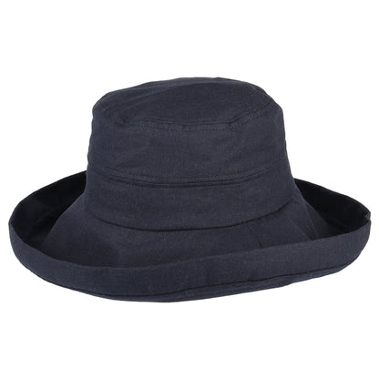 El sombrero de sol Lily plegable de sur la tête en azul marino es un hermoso y ligero sombrero de verano para mujer. Confeccionado en una mezcla de lino y algodón, este sombrero te sentará genial. El borde mide 9,5 cm de ancho antes de curvarse hacia arriba otros 2,5 cm. Un cordón ajustable en el interior del sombrero significa que puedes ajustar el tamaño de este sombrero a la perfección.