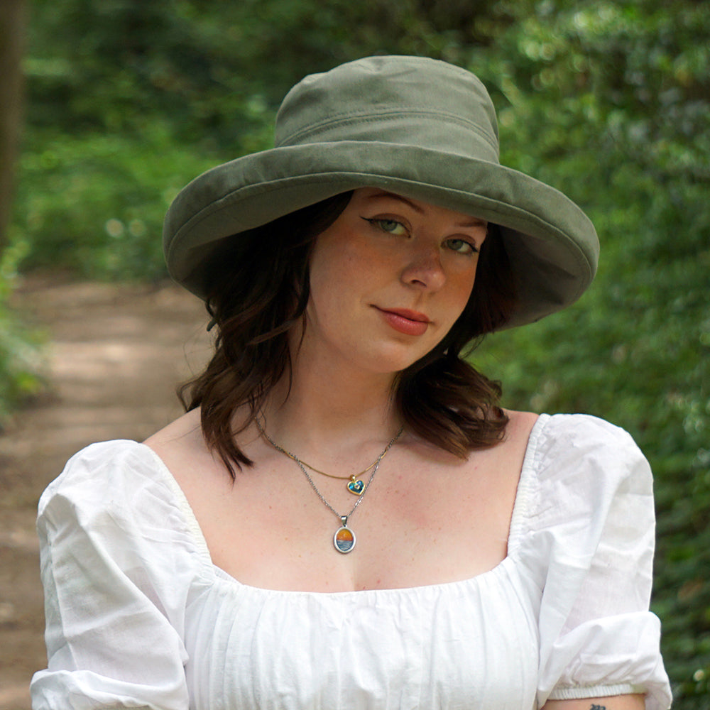 El sombrero de sol Lily plegable de sur la tête en verde oliva es un hermoso y ligero sombrero de verano para mujer. Confeccionado en una mezcla de lino y algodón, este sombrero te sentará genial. El borde mide 9,5 cm de ancho antes de curvarse hacia arriba otros 2,5 cm. Un cordón ajustable en el interior del sombrero significa que puedes ajustar el tamaño de este sombrero a la perfección.