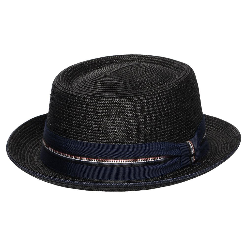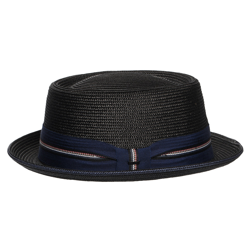 Aquí está el sombrero Pork Pie Carver de Bailey Hats en color negro. Este hermoso pork pie de verano no tiene forro para mayor ventilación y viene con una cinta interior de algodón para mayor comodidad. El sombrero está decorado con una cinta a rayas y una insignia de Bailey cosida en el lateral.